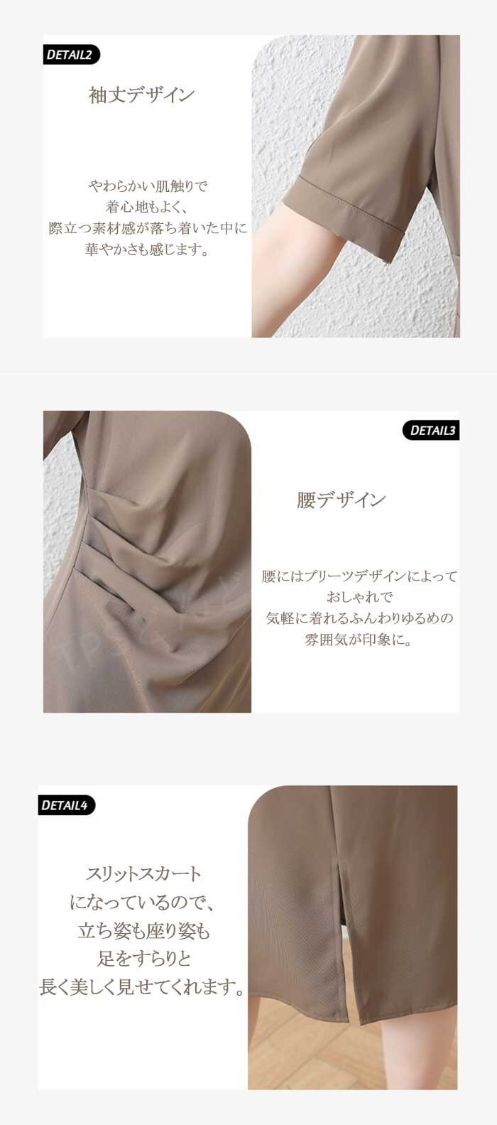 <p>やわらかい肌触りで軽くて着心地もよく、女性らしい華やかなスタイルが1枚で完成します。膝が隠れるくらいの絶妙なミディアム丈ワンピースで、足首が細く見えて美脚効果が抜群です。<br><br>