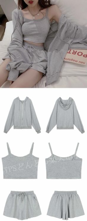 【送料無料】ルームウェア レディース セットアップ 上下セット パーカー キャミ ショーツ 春 部屋着 ワンマイルウェア 可愛い お洒落 シンプル 無地 クロップド丈 スウェット ポケット付き 韓国 グレー 母の日 | TPSどんどん