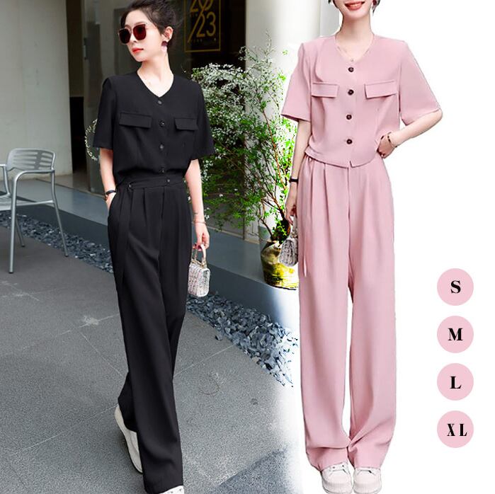 ボタン前開き半袖トップスは知的でスタイリッシュです!ワイドパンツのウエストは後ろゴム仕様で着やすくて前リボン飾りでナチュラルなくびれができ、スラッとしたシルエットになれて、女性らしさを引き立ています。ウエストラインをすこし高めにして足長効果も期待できます。