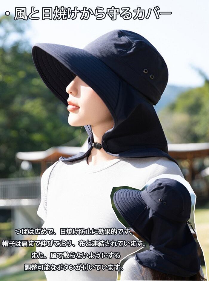 <p>つばは広めで、日焼け防止に効果的です。帽子は肩まで伸びており、布と連結されています。また、風で散らないようにする調整可能なボタンが付いています。