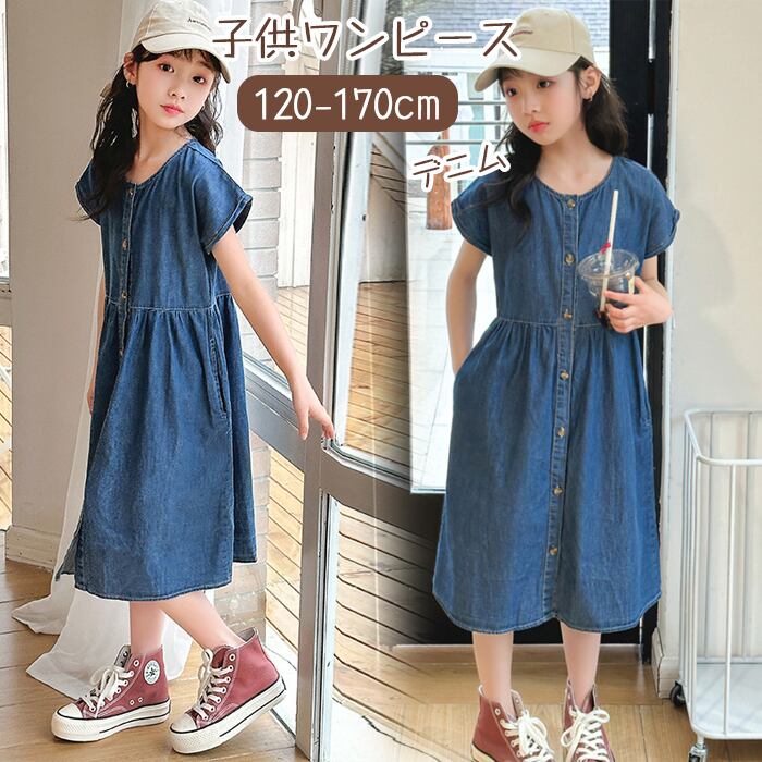 子供服 デニム 女の子 ワンピース 半袖 夏 デニムスカート ロングスカート シャツワンピース ボタン 前開き クルーネック 薄手 サマードレス カジュアルワンピース 膝下 キッズ ガールズ ゆったり 普段着 通学着 女児 120 130 140 150 160 | TPSどんどん