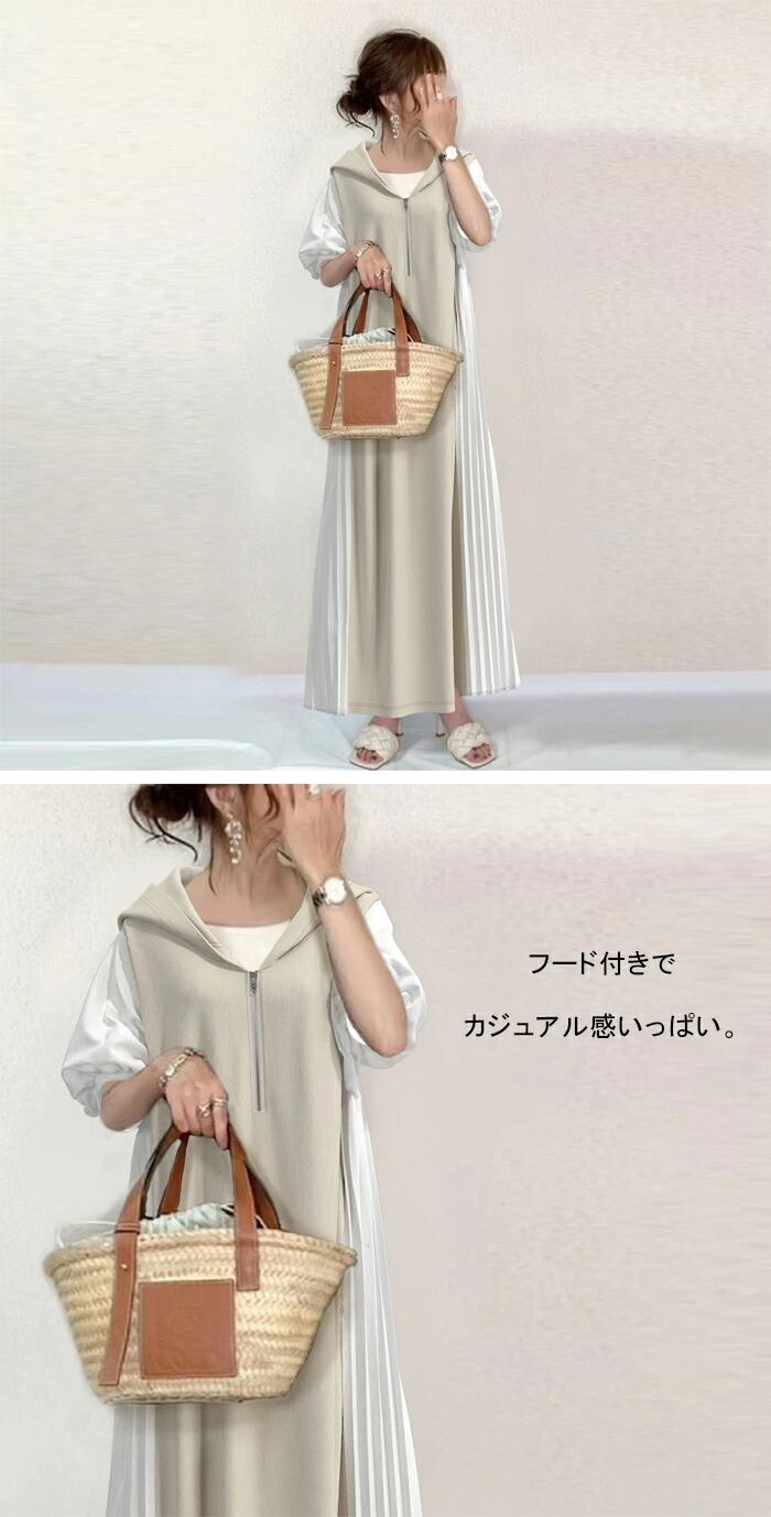 ワンピース レディース 夏 きれいめ 半袖 フード付き カジュアル フリル 切り替え プリーツワンピース 重ね着風 大人 可愛い 通勤 普段着 OL カジュアル ロングワンピース ロングワンピ マキシ マキシワンピース Aライン 無地 シンプル | TPSどんどん