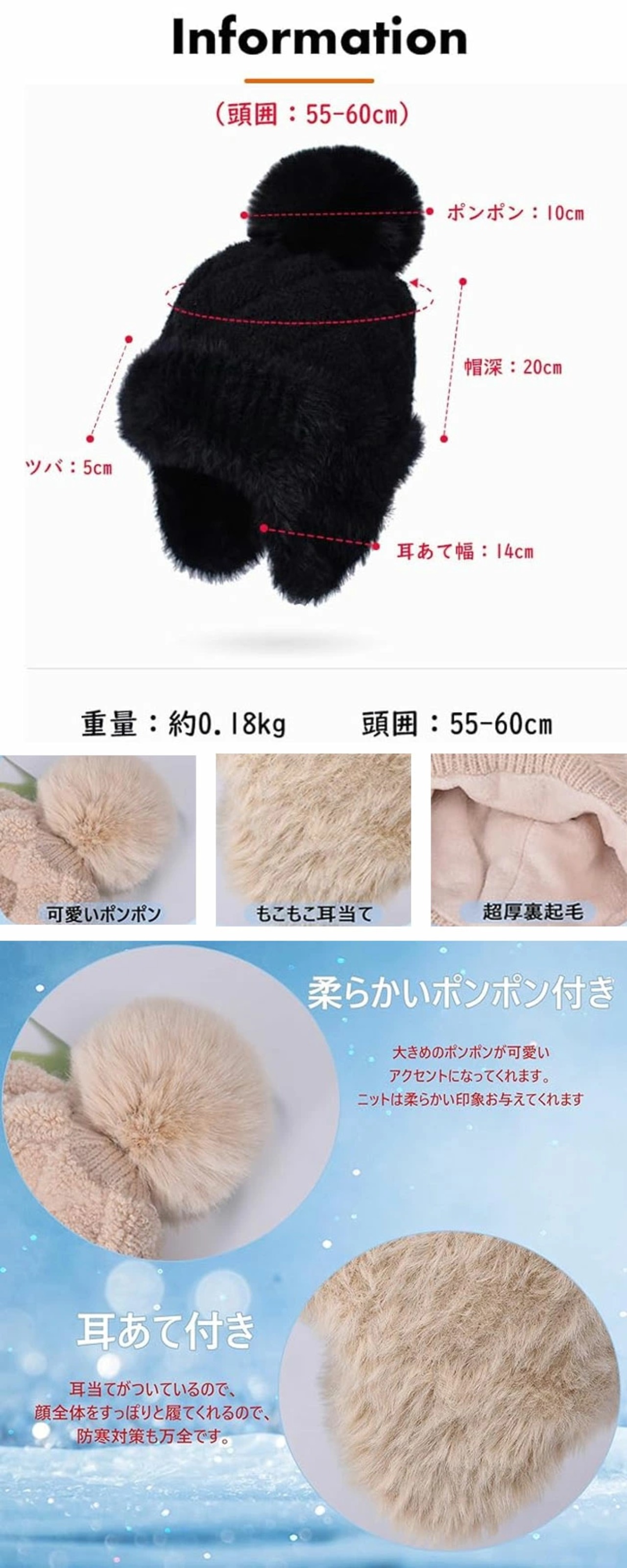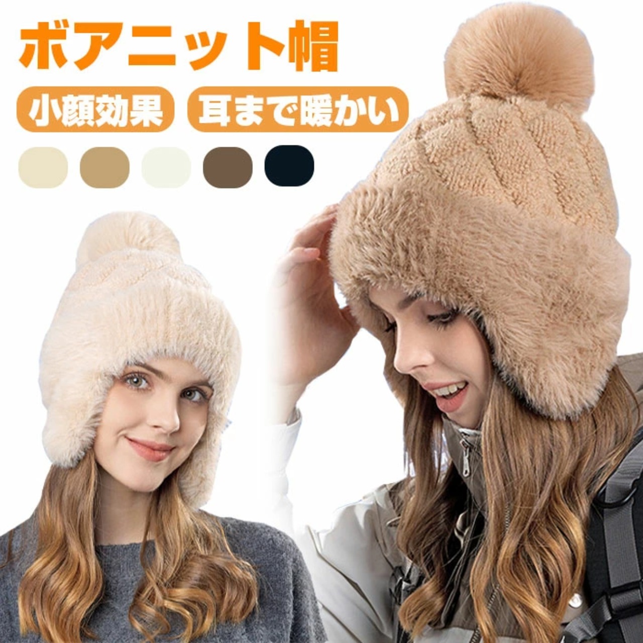ニット帽 耳あて付き レディース 帽子 裏起毛 レディース ニット帽子 防寒 防寒帽子 ボア ポンポン 防風 冬 女性 おしゃれ かわいい 柔らかい 暖かい かわいい 防風 大人可愛い 小顔効果 ベージュ ブラック | TPSどんどん