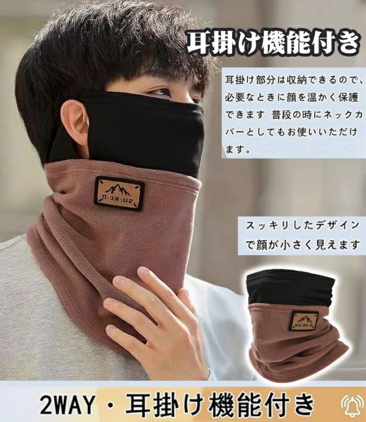 耳掛け機能が付いており、必要に応じて顔周りをしっかり保温できます。縫製強化、口元からズリ落ちにくい。風や寒さから顔と首をよく守れて、寒い日に大重宝です。