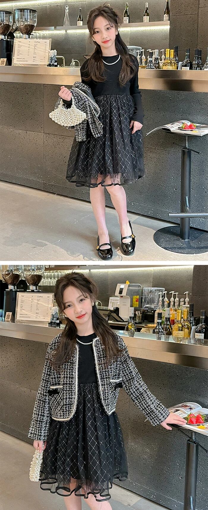 <千鳥柄のジャケットとチュールワンピースの組み合わせ、大人顔負けのスタイリッシュなデザインでかっこよくキメて
