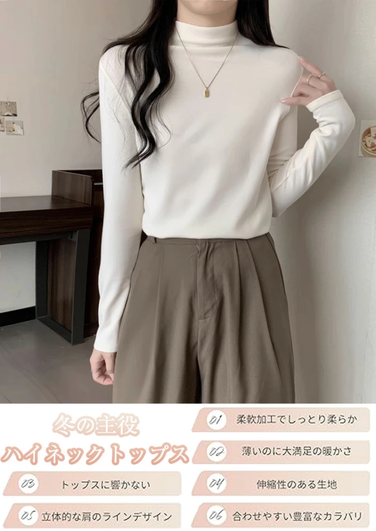 シンプルで着まわしの効くベーシックハイネックトップスが今年も登場です!ハイネックインナー トップスのシルエットが首もとは主張すぎず、すっきり着れて顔周りを小顔に見せてくれます。