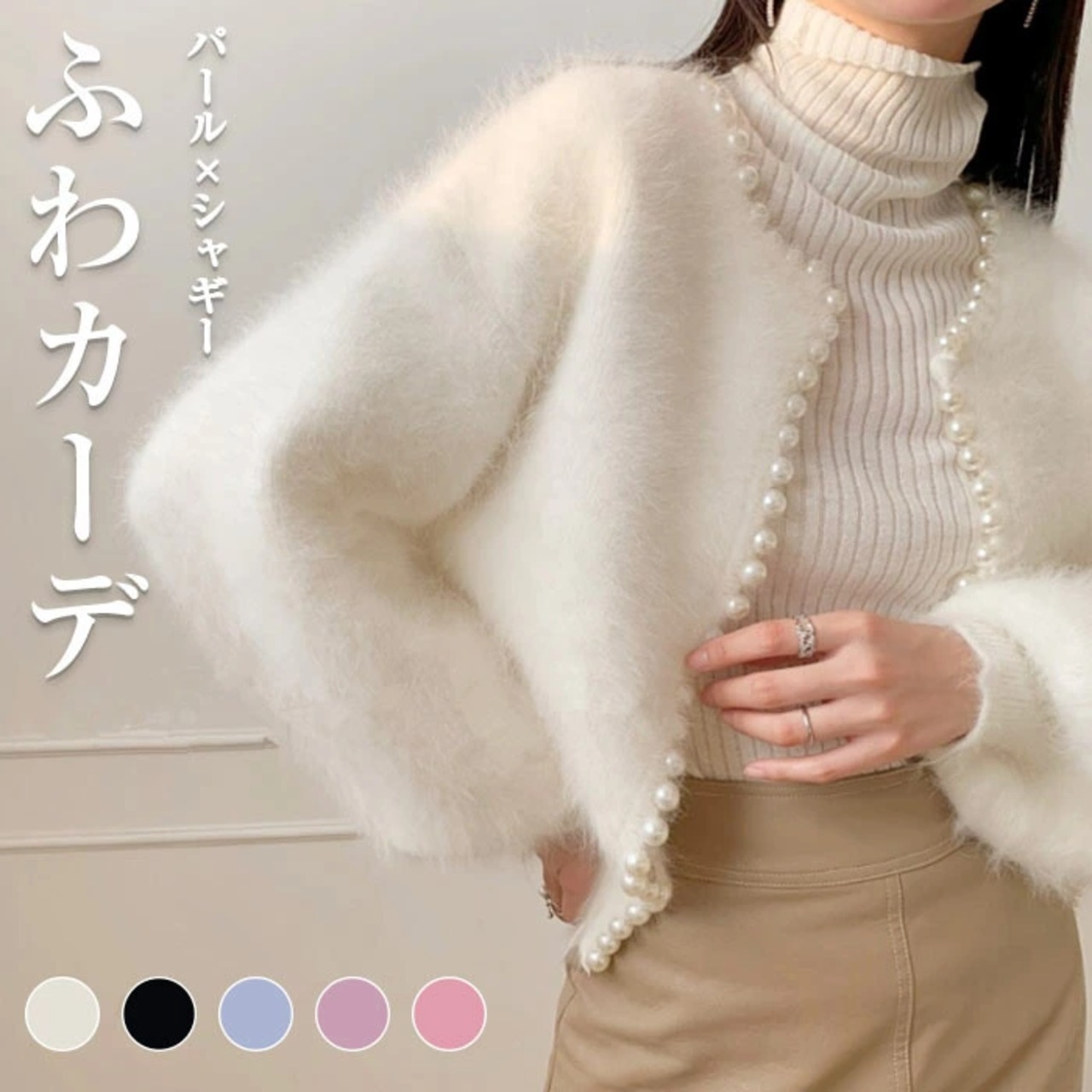 送料無料 シャギー ニット ふわふわ カーディガン レディース シャギー シャギーニット パールビーズ 暖かい リブ ノーカラー 毛足 長め 柔らかい カラーニット ミドル丈 長袖 ドロップショルダー トップス ボタンなし ゆったり タックドカフス 中厚手 羽織 秋冬 防寒 白 | TPSどんどん