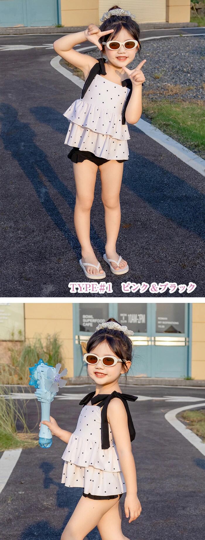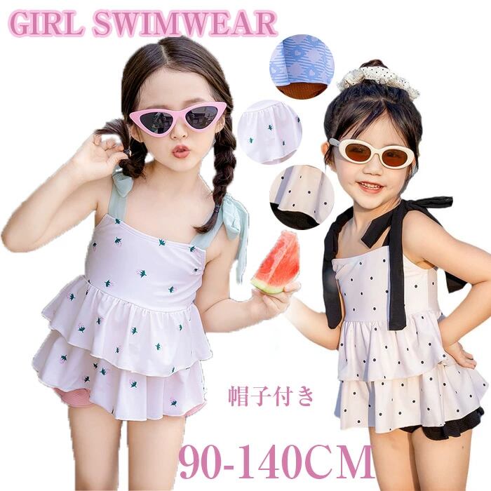 キッズ 水着 女の子 オールインワン ペプラム風 花柄 リボン トップス ショーツ スイムキャップ 2点セット ワンピースフリル パフスリーブ 肩ひも調節 帽子付き 日焼け対策 90 100 110 120 130 黒 保育園 幼稚園 かわいい | TPSどんどん