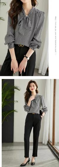 クラシックな千鳥柄とリボンタイが特徴的な長袖レディースブラウス、エレガントで洗練された雰囲気を演出。