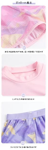 【日焼け防止】長袖ラッシュガード&レギンスで肌の露出を控えて、夏の強い日差しから柔らかな肌をしっかり守ります。擦り傷防止にもなります。セパレートのデザインで、お着替えもおトイレも便利です。