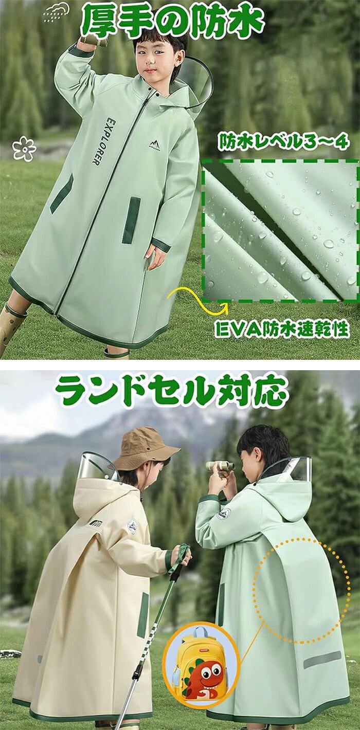 【防水防風機能】この子供用レインコートはEVA高い防水性、丈夫で手触りの良い素材を採用、雨の日でも快適に着用できます。防水ジッパーのデザインで、レインスーツの防水性は抜群です。 ハイネックで防風性も高く、襟元からの雨の飛散も防いでくれます。