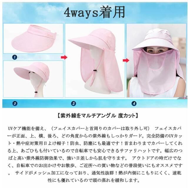 UVカット効果抜群!お顔を保護してくれます。自転車で買い物、スポーツ観戦、ペットの散歩やガーデニング様々のシーンにはもちろん、旅行、海水浴、登山などのアウトドア場合にも対応できます。