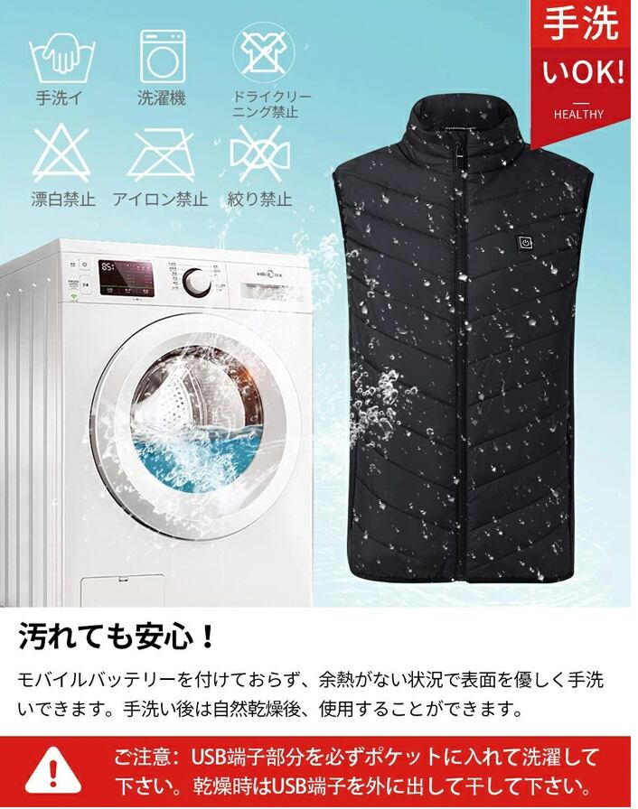 余熱がない状況で手で水洗えます。洗濯する前に必ずバッテリーを取り外してください。強力に揉まないで下さい。ベストはUSBケーブルが付属しており、市販のUSB2A・5V出力モバイルバッテリーで使用可能!