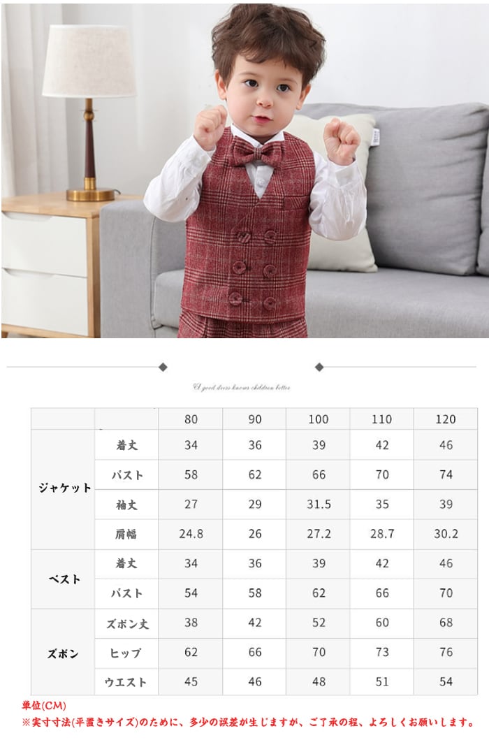 普通着としてもかっこいいです!お食い初め・初節句・七五三・結婚式・入学式・卒業式・セレモニー、お宮参り・発表会用にオールマイティーに使える子供フォーマルスーツ大流行グレーンチェックのジャケット/シャツ/パンツ/蝶ネクタイのスーツ4セットです