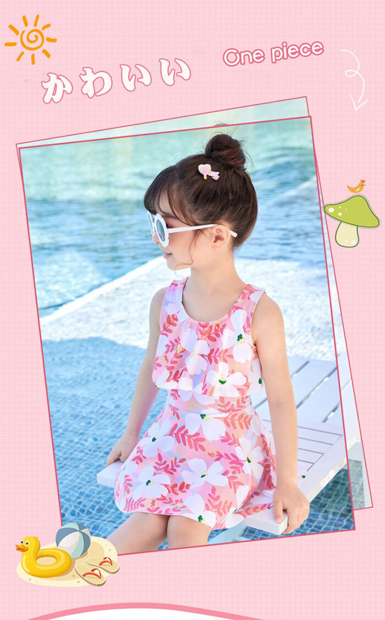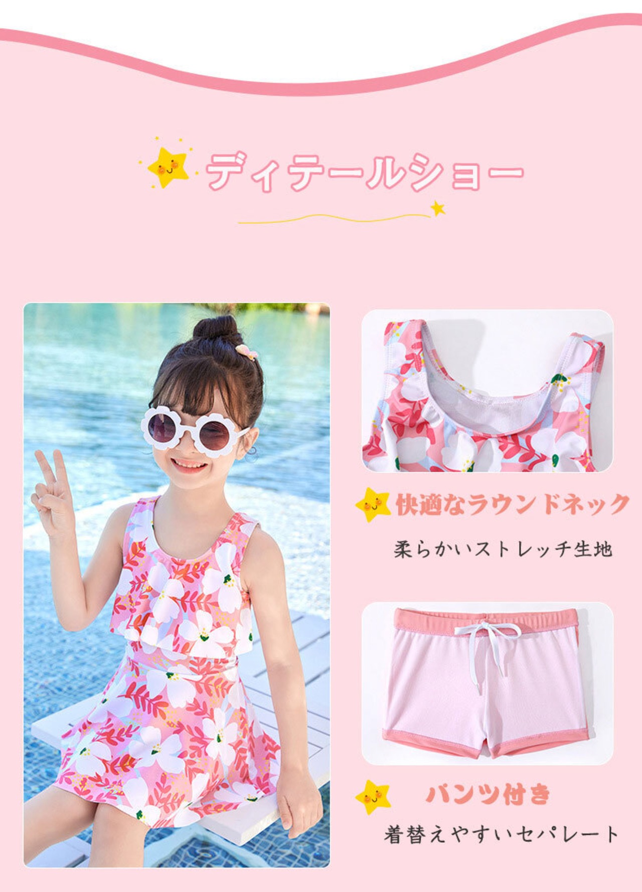 <p>日焼け止めが苦手、敏感肌のお子様でも、お肌への負担なく紫外線対策ができますよ。 濡れた身体でも手早く着替えられるセパレートタイプでご用意!<br>
