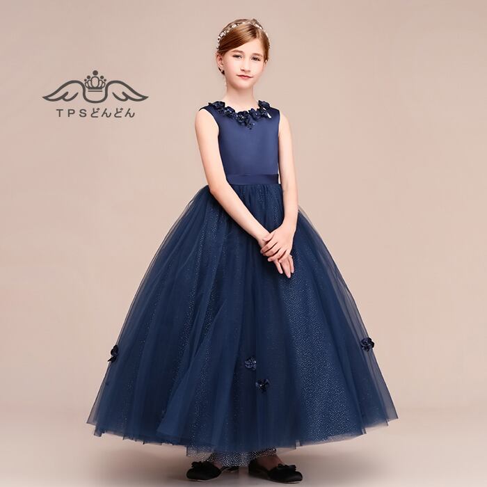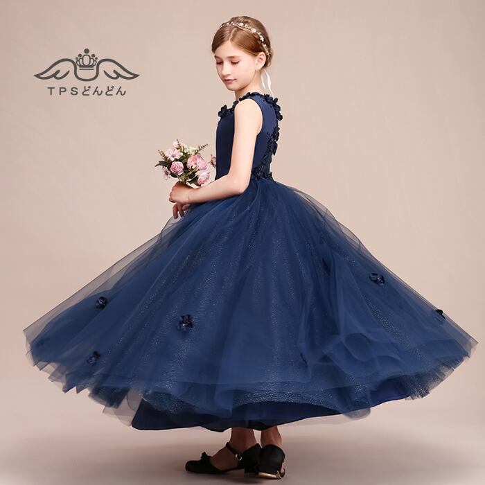 【送料無料】発表会 ドレス 子供 豪華ドレス 子供ドレス ロングドレス ピアノ発表会 ドレス ジュニアドレス 160 150 140 チュールドレス 子どもドレス 発表会 演奏会 コンクール ワンピース ドレス 結婚式 二次会 花嫁 ネイビー | TPSどんどん