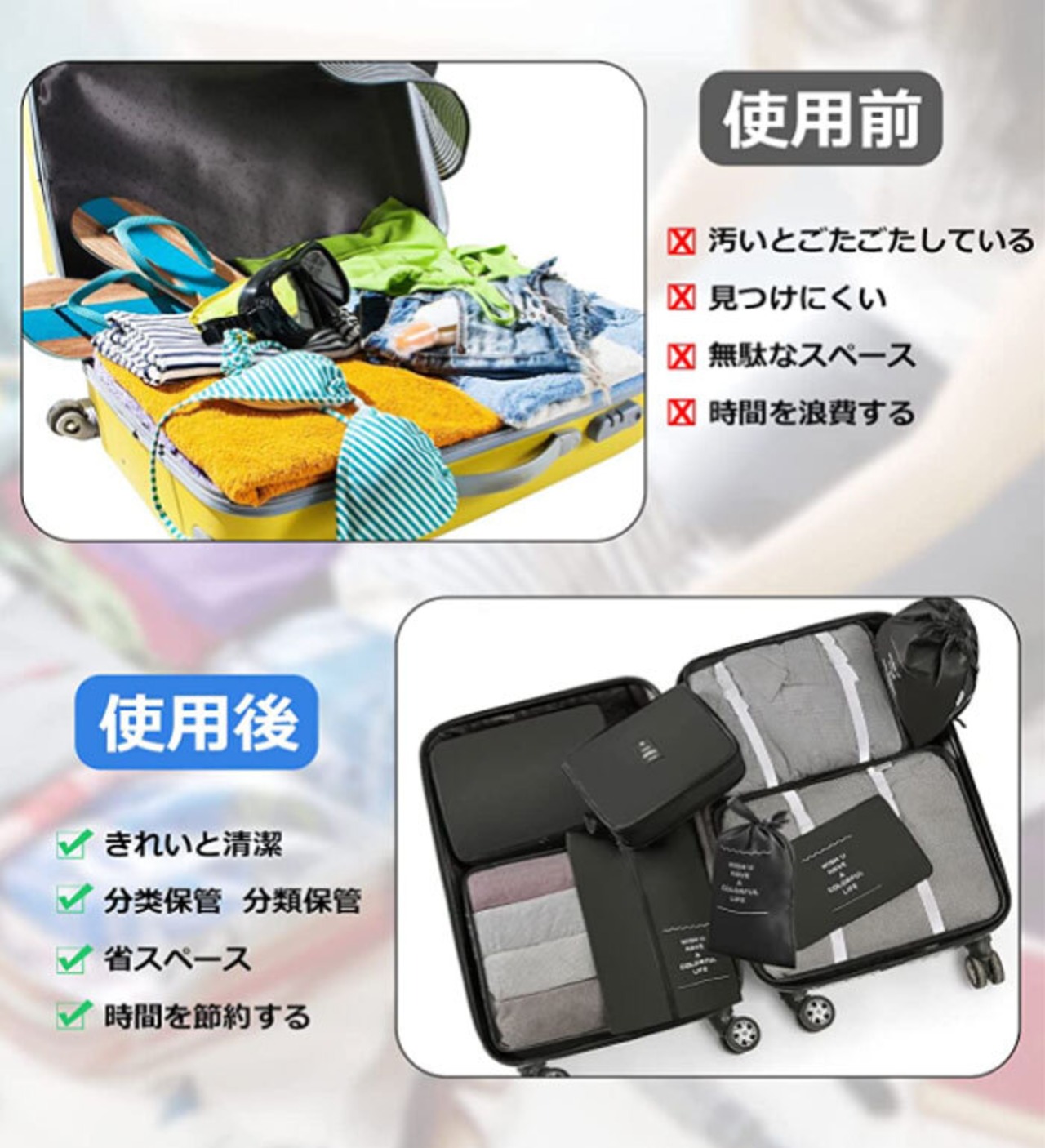 2. 【バックルのデザイン】衣類収納バッグセットは、衣類、汚れたシート、下着、靴、化粧品、トイレタリー、電子アクセサリーをうまく保管および分類できます。物事をきちんと整頓しておくと、衣服のしわやその他の旅行による損傷を減らすことができます。
