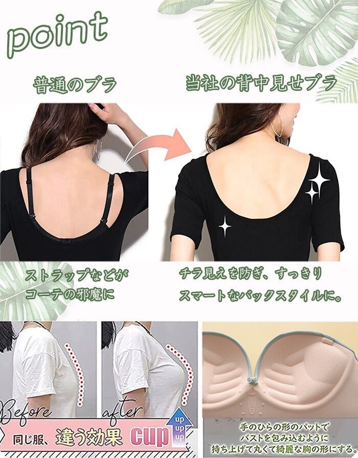 【最強の盛り・寄せブラ】脇高のデザインおかけで脇肉、贅肉をしっかり締めてアップする。ストラップレスブラ自体しっかりしていてクッションもふんわりしているので、良い感じです。伸縮性があるので無いものに比べるとホールド感も強く感じます。本来の位置に戻ることで脇肉すっきりバストはボリュームアップ!手の型のようなパッドによって、下からバストを優しく持ち上げ魅力的な谷間メイク。ノンワイヤーなので、一日中着けてても痛くならなかったです<br><br>