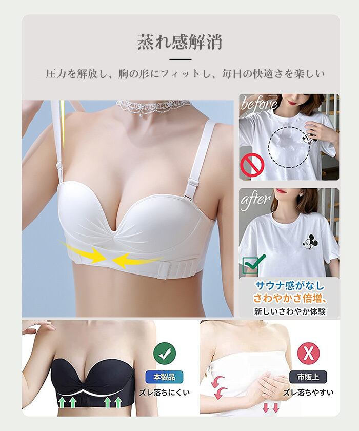 【滑り止めがあり・安定感抜群!】ストラップレスブラのバックの横ベルトに滑り止め加工を施す、胸下にフロントホック付き、激しく動い時の震動軽減ができます。カップ内の盛りパットが十分。マッサージの顆粒付きため、つけ心地が良いです。また胴回りの部分裏についているラバー素材のような滑り止めの効果が絶大。乳房を集めてセクシーにする調節可能なフロントホックデザイン。谷間メイクの同時に安定感もプラス!ダンスで使用してもずれず、思い切り踊れました!<br><br>