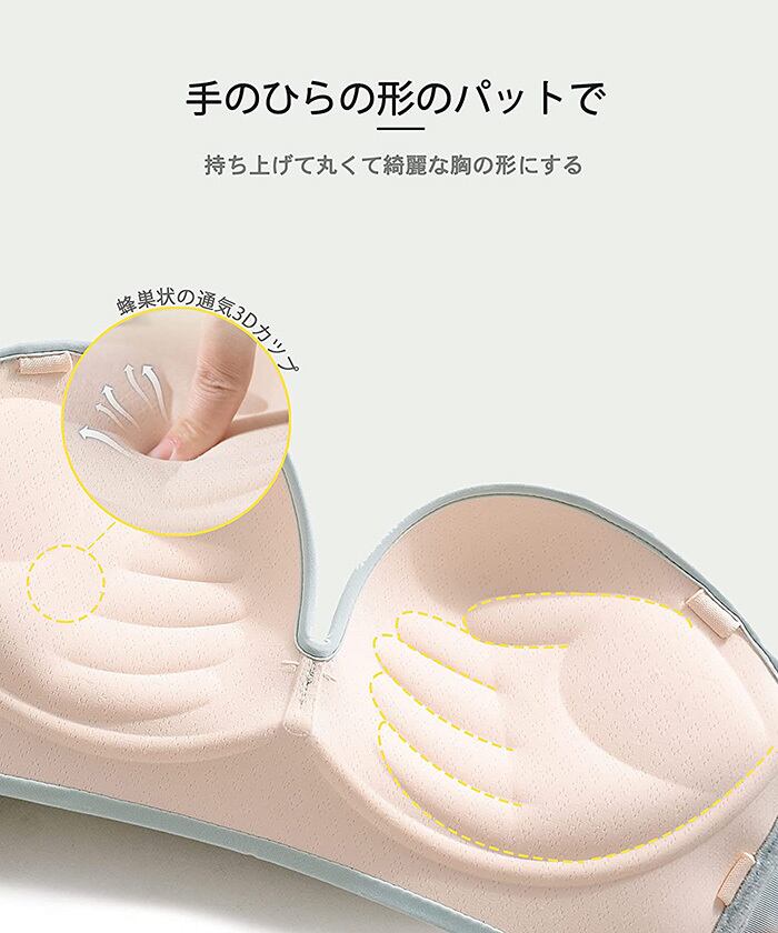 【最強の盛り・寄せブラ】脇高のデザインおかけで脇肉、贅肉をしっかり締めてアップする。ストラップレスブラ自体しっかりしていてクッションもふんわりしているので、良い感じです。伸縮性があるので無いものに比べるとホールド感も強く感じます。本来の位置に戻ることで脇肉すっきりバストはボリュームアップ!手の型のようなパッドによって、下からバストを優しく持ち上げ魅力的な谷間メイク。ノンワイヤーなので、一日中着けてても痛くならなかったです<br><br>