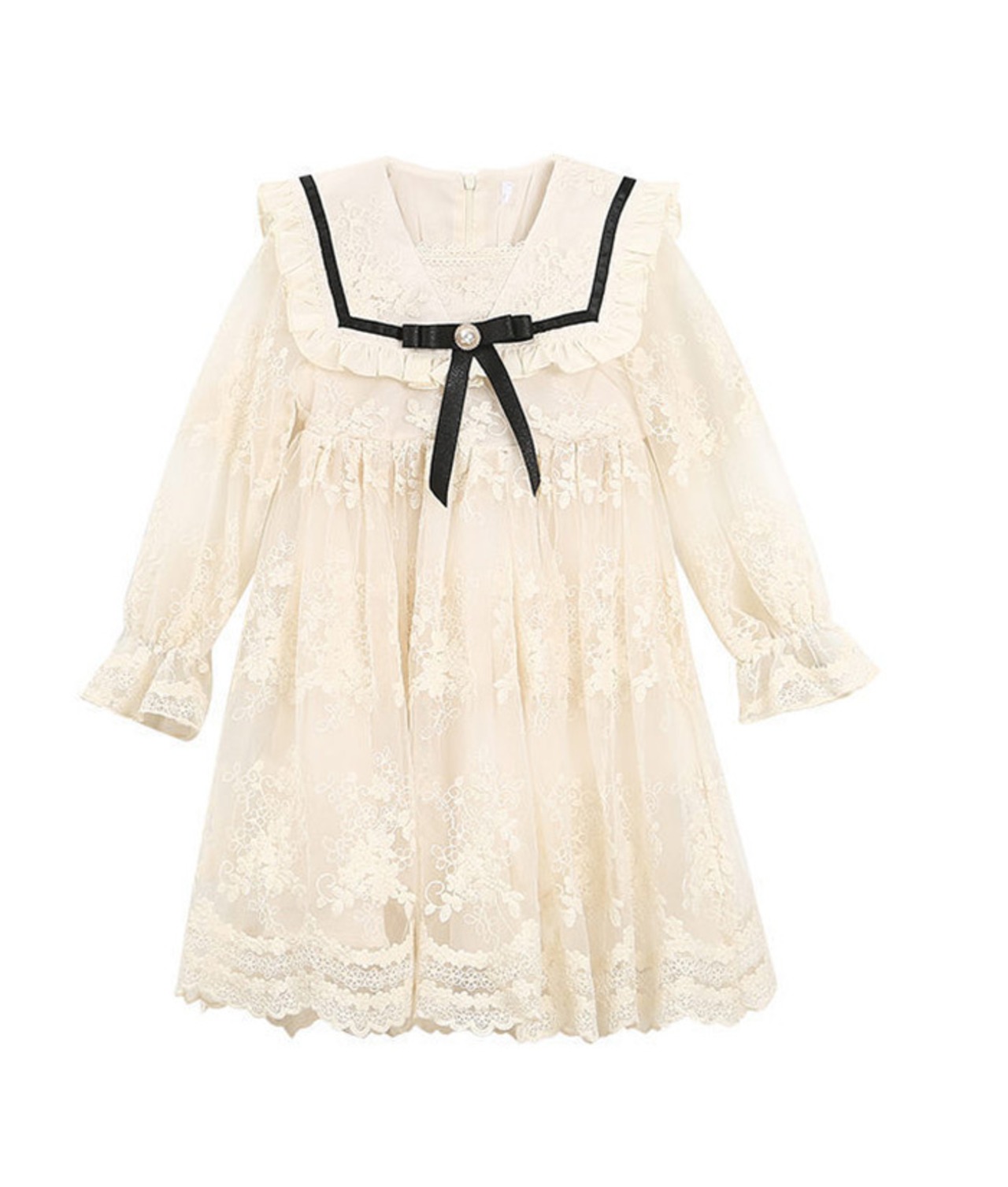 <p>上品なレース生地で細工な仕立てた華やかな子供ワンピースです。高級感溢れて子供の可愛さを演出できます。</p>