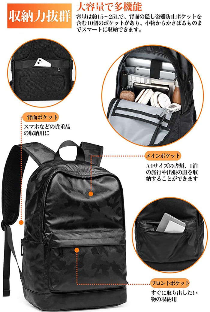背面の隠し盗難防止ポケットを含む10個のポケットがあり、小物からかさばるものまでスマートに収納できます。<br>A4サイズの書類、15.6インチノートパソコン、9.7インチタブレット、2日1泊の服、鍵、ペンや水筒など様々に対応可能です。<br>出張・旅行に欠かせないキャリーオン機能も搭載します。<br><br>