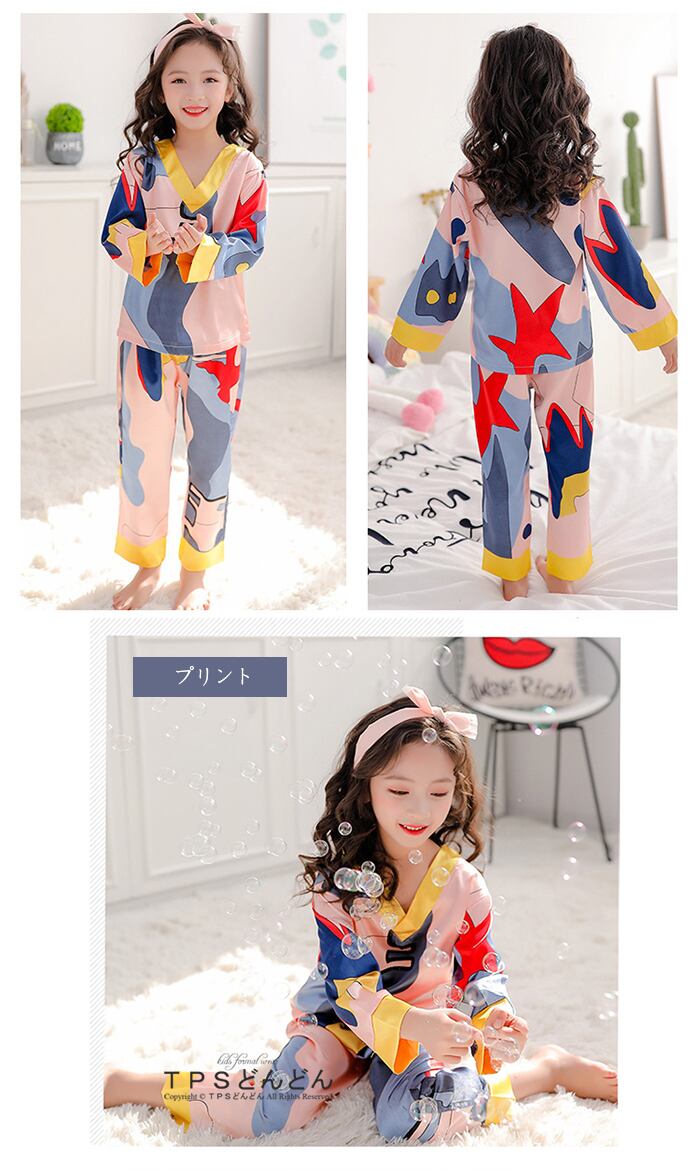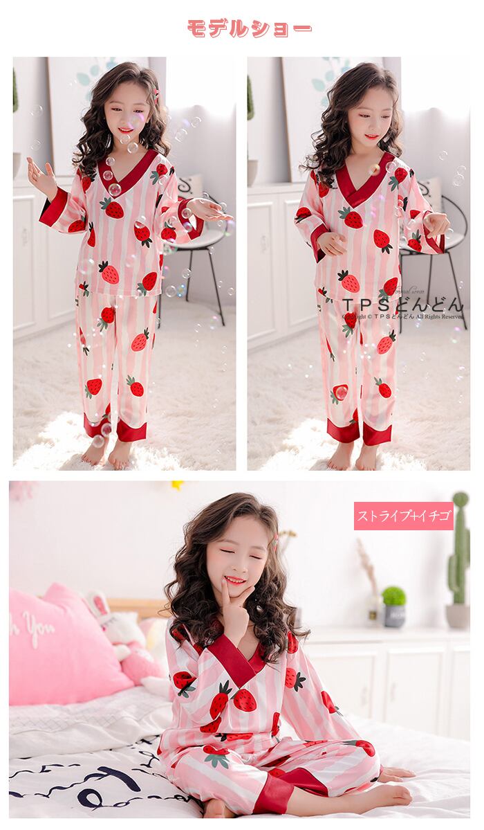 パジャマ キッズ ルームウェア Vネック 長袖 子供 女の子 キッズ パジャマ アイスシルク 上下セット 2点セット イチゴ プリント 部屋着 涼しい ナイトウェア 子供服 トップス ズボン セットアップ 肌着 快適 おしゃれ 可愛い 寝間着 | TPSどんどん