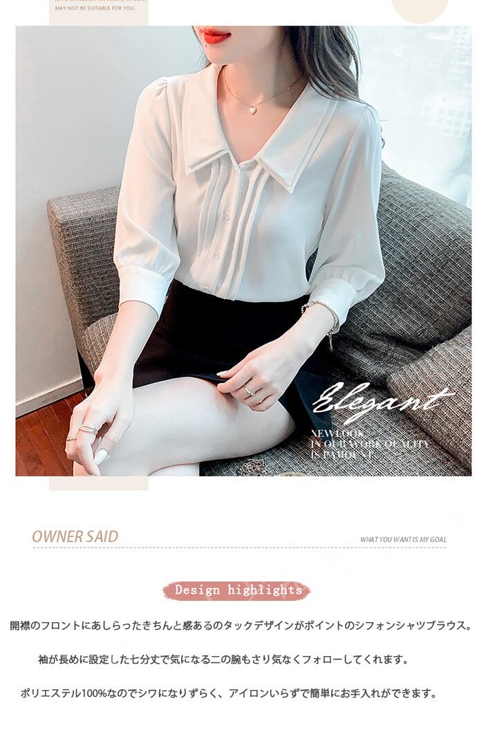 開襟のフロントにあしらったきちんと感あるのタックデザインがポイントのシフォンシャツブラウス。袖が長めに設定した七分丈で気になる二の腕もさり気なくフォローしてくれます。ポリエステル100%なのでシワになりずらく、アイロンいらずで簡単にお手入れができます。</p>