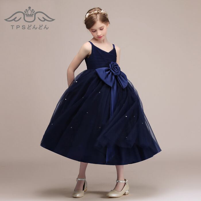 【在庫処分】【高級豪華ドレス】【送料無料】子供ドレス 発表会 子供ドレス ピアノ発表会 ジュニア ロング ドレス 演奏会 結婚式 キッズ ワンピース フォーマル ドレス コンクール コンサート 七五三 高級 大きなリボン ネイビー 120 130 140 150 160 | TPSどんどん