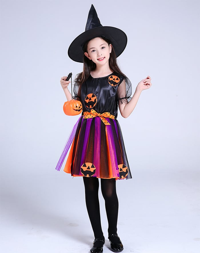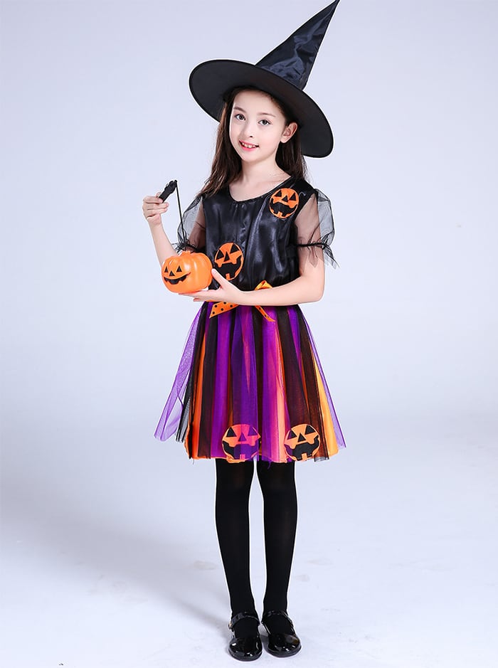 ハロウィン コスプレ 衣装 女の子 魔女 仮装 ハロウインコスチューム 女の子 帽子付き 2点セット 女子 子供用 子供 ウィッチ ドレス おばけ お化け お面 かぶりもの かぼちゃ ハロウィーン パーティー グッズ 変装 パープル110 120 130 140 150cm | TPSどんどん