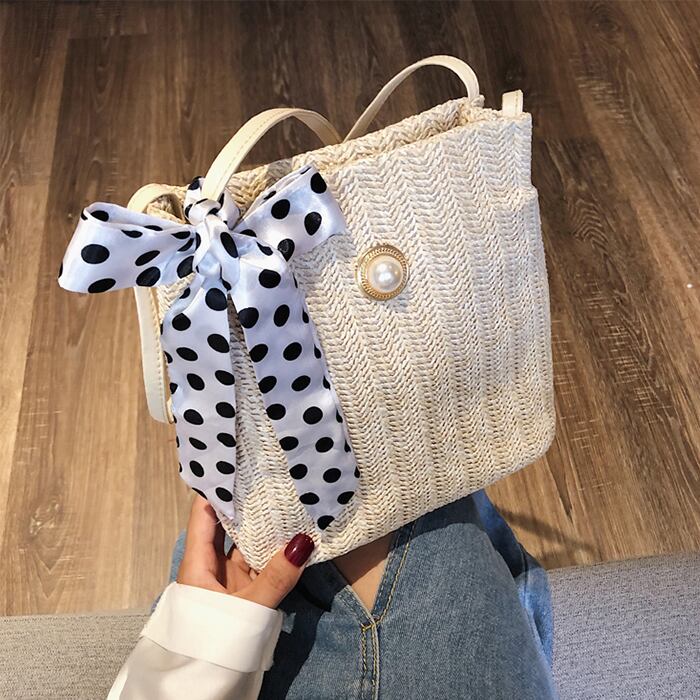 商品名 かごバッグ 麦わらバッグ 軽量 斜め掛け 肩掛け 草編みバッグ 春 夏 旅行 可愛い おしゃれ 大容量 水玉リボン 真珠