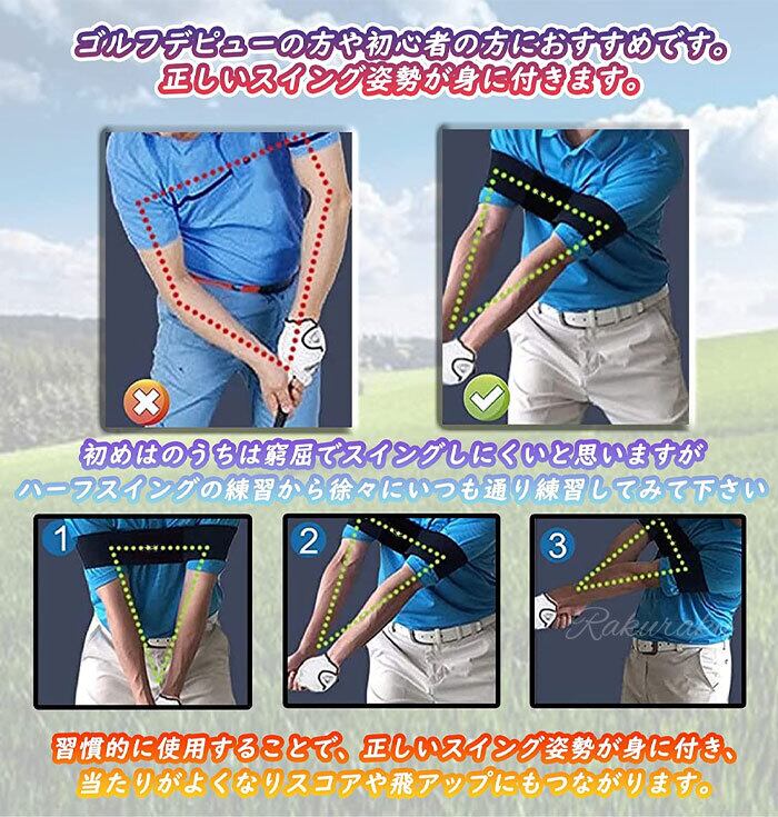【高品質の素材、伸縮性が高く!】伸縮性の優れた素材で設計しておりますので、長くご使用いただいても変形しにくく、非常に耐久性が高いアイテムです。弾力のあるナイロン素材を使用しておりますので、ほとんどの方の腕にフィットするようになっております。本体はコンパクトな設計ですのでゴルフバックやその他バッグに入れて手軽に持ち運びすることができます。自宅、または練習場でのゴルフトレーニングやフォーム修正、フォーム矯正に最適なゴルフ練習用品となっております。