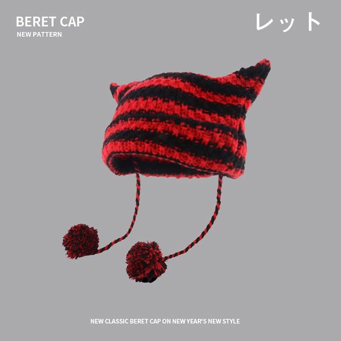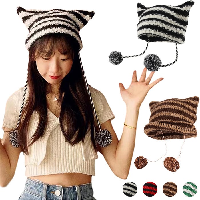 【送料無料】帽子 レディース 秋冬 猫耳型 ニットデビルハット 防寒 ニット帽子 防風 折りたたみ ストライプ柄 帽子 手作り 猫耳型 保温サイクリングハット ソフトニット帽 男の子 女の子用 カラーマッチングニット帽 ソフトニット帽 | TPSどんどん