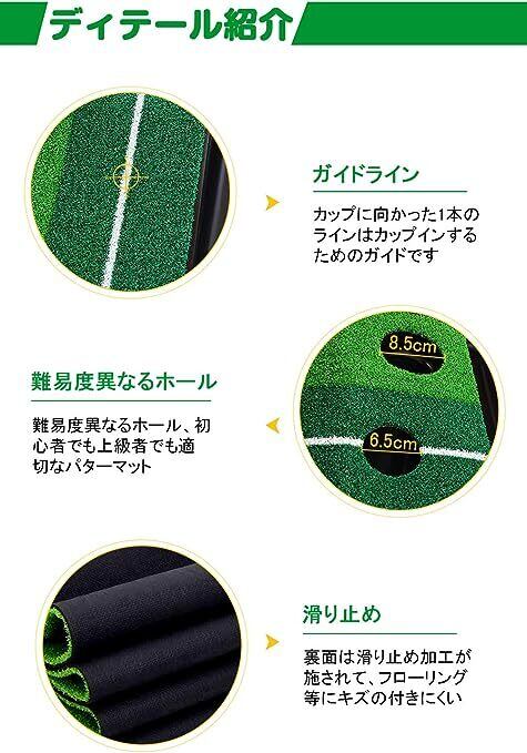 【自宅でいつでもパター練習】お部屋にマットを広げるだけで本格的なパター練習ができるゴルフマットです。裏面は滑り止めのラバー加工が施されており安定してプレイをすることができます。芝は極上のベント芝のタッチを再現し、環境に優しい高硬度プラスチックで作られているので、耐久性が高く、取り付けも簡単。初心者の方でも人目を気にせず、寒い日でも、雨の日でも自宅で効果的なパター練習ができます。中級者~上級者の方にもご利用して頂けるパター練習器具なので、ぜひ練習を重ねて、スキルアップ&スコアアップを目指してください。