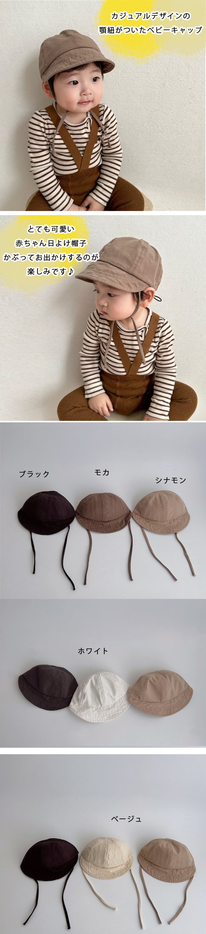 <p>カジュアルデザインの顎紐がついたベビーキャップ</p>