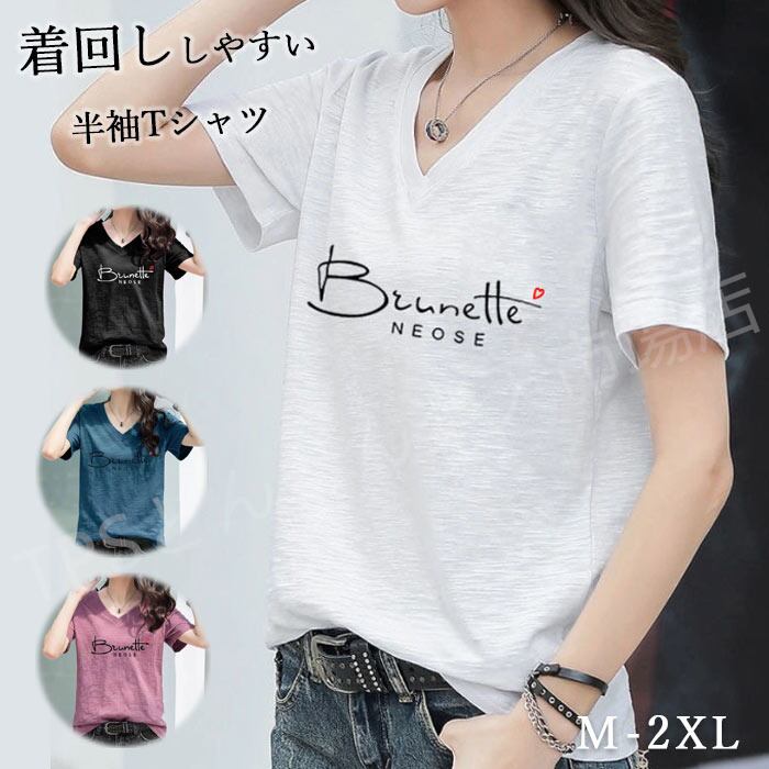 送料無料 tシャツ レディース 半袖 カジュアル vネック サイズ ロゴTシャツ 半袖 プリントTシャツ 半袖tシャツ おしゃれ シンプル 無地 ブラック ホワイト Tシャツ レディース トップス レディース 春夏 きれいめ 30代 40代 | TPSどんどん