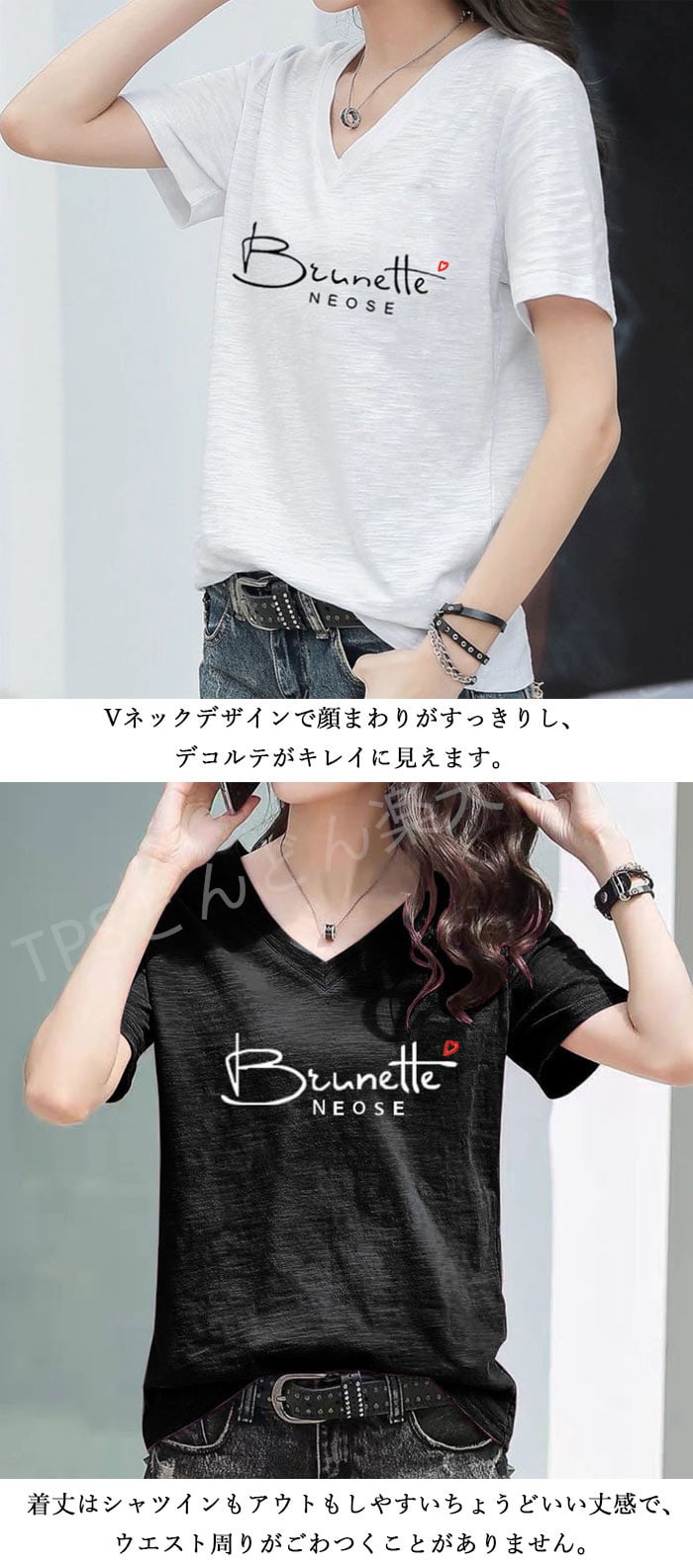 <p>Vネックデザインで顔まわりがすっきりし、デコルテがキレイに見えます。着丈はシャツインもアウトもしやすいちょうどいい丈感で、ウエスト周りがごわつくことがありません。<br>