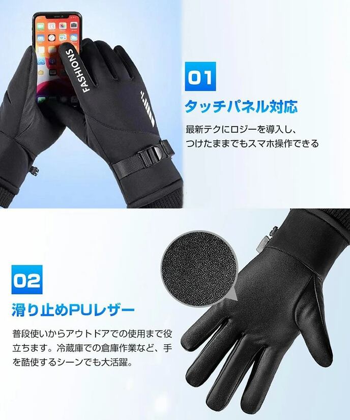<p>【タッチパネル対応・滑り止め加工】防寒手袋 メンズの 五指の先端部分は特別な導電素材を使用し、手袋 メンズを着用したままでも、スマートフォンやタブレットPCの使用することができます。また、手袋の手のひらと指部分には滑り止め素材が採用されており、耐摩耗性のある革素材で摩擦やグリップ力が向上します。これにより、道具を持つ際にも安定感を保ち、運転中のハンドルの制御力を高めることができる手袋 メンズです。</p>